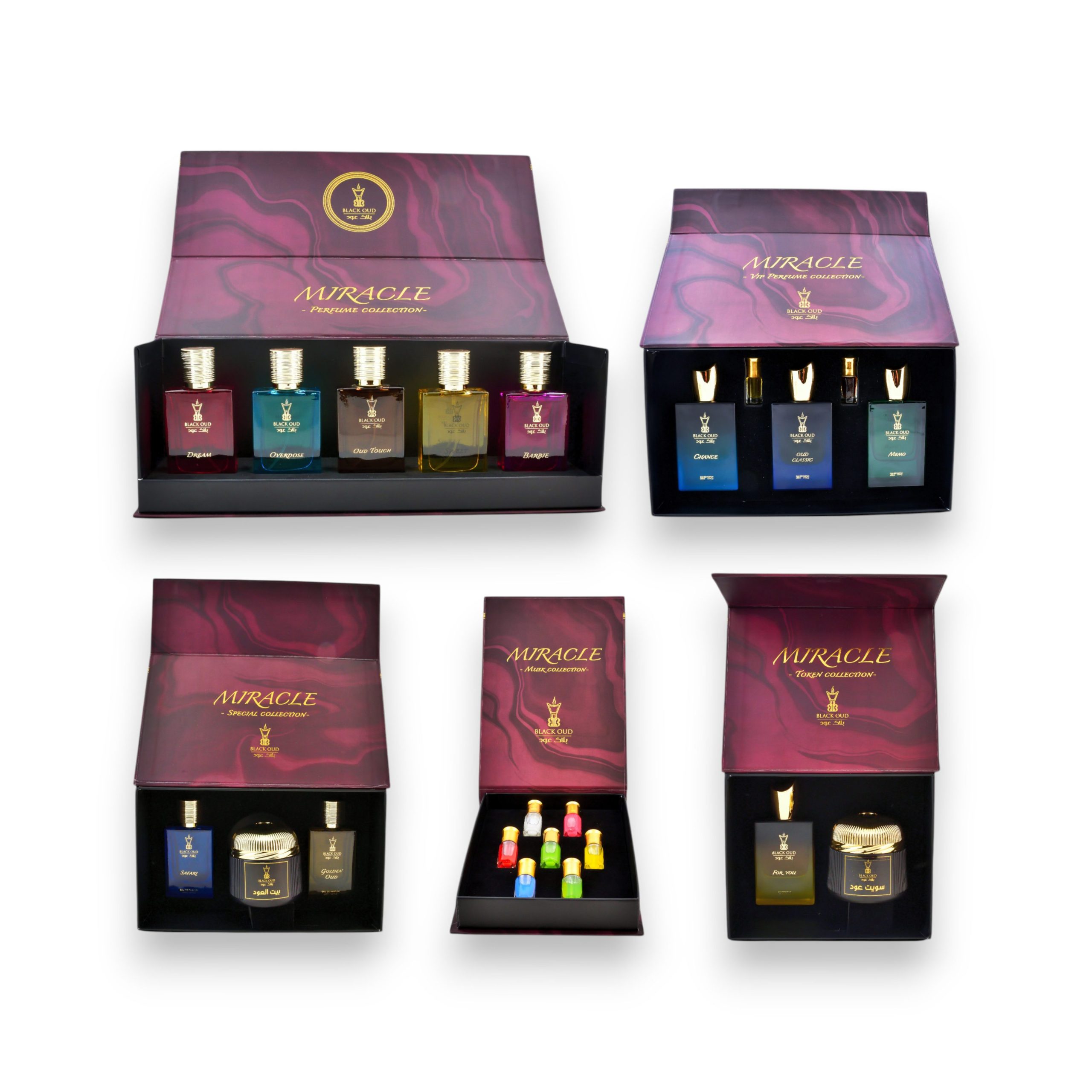 An exceptional collection of five boxes, meticulously crafted to suit all tastes and occasions, blending luxury perfumes, pure musk, and the heritage of Oud.