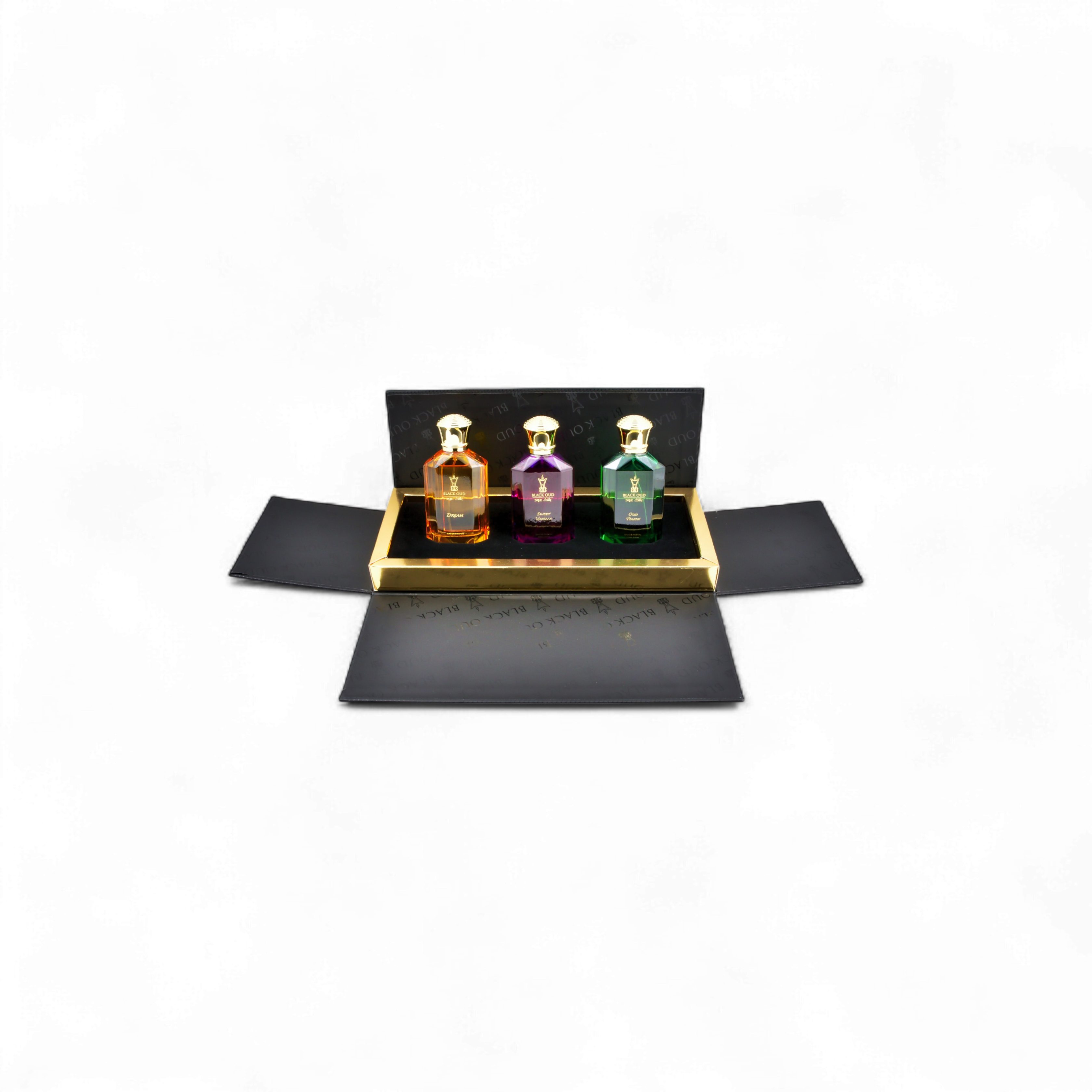 دلّل حواسك مع مجموعة بلاك عود الفاخرة التي تضم باقة منتقاة بعناية من ثلاثة عطور مميزة. تأتي كل رائحة داخل زجاجة أنيقة بتفاصيل ذهبية، موضوعة في علبة فاخرة بتصميم راقٍ تُفتح لتكشف عن روعة العطور بداخلها.